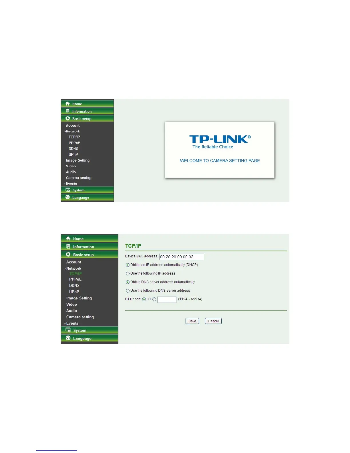 This page displays the MAC address of the Camera and it’s also used for the TCP/IP configuration.