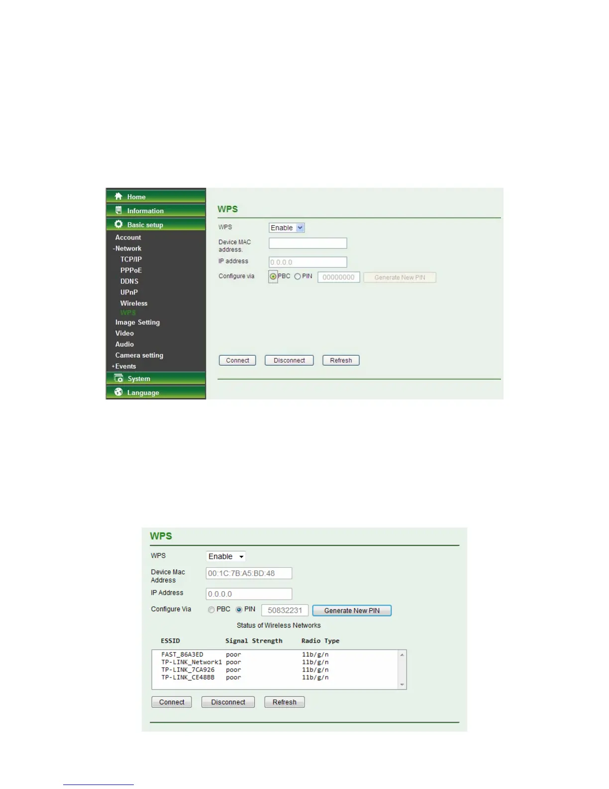 wireless connection between wireless Camera and router using either Push Button Configuration (PBC)