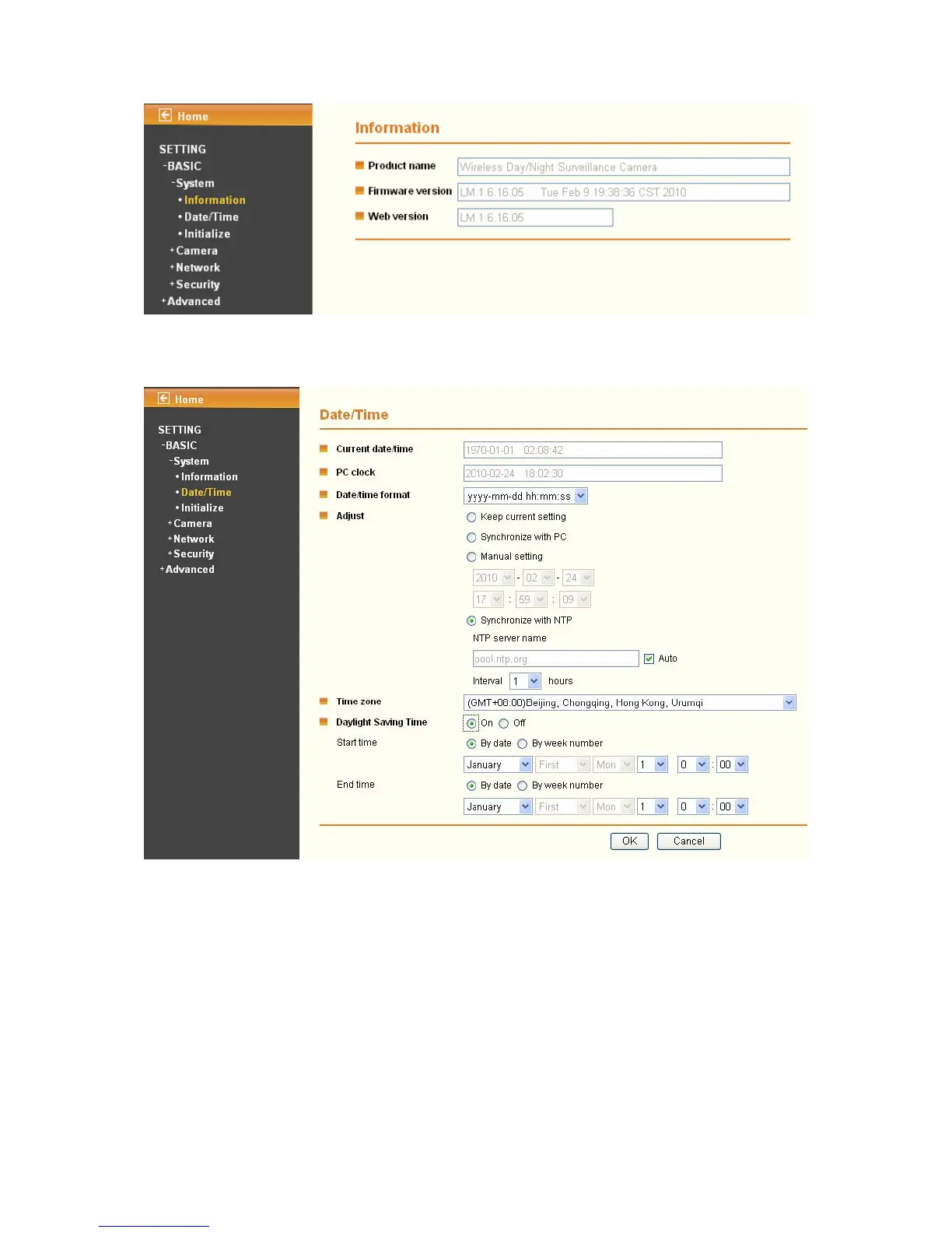 The Date/Time page displays all options of time setting.