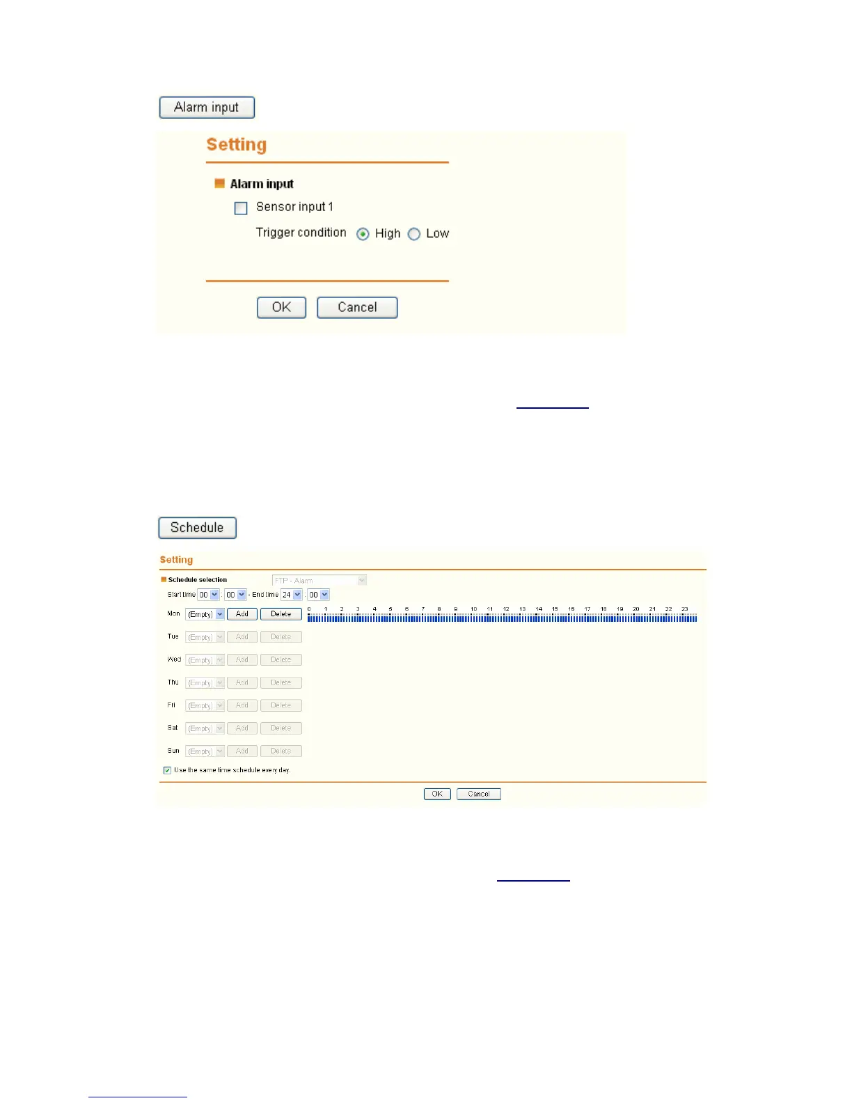 You can set the alarm input function at Alarm Input page. (Please go “Setting → Advance →
