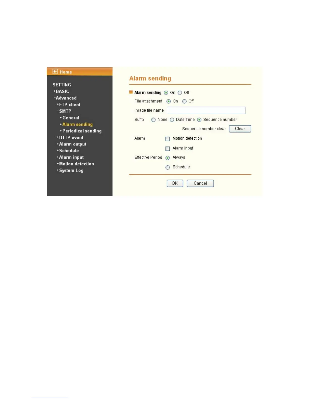 ¾ Alarm sending: Select On to set to send mail with connection to the alarm detection.