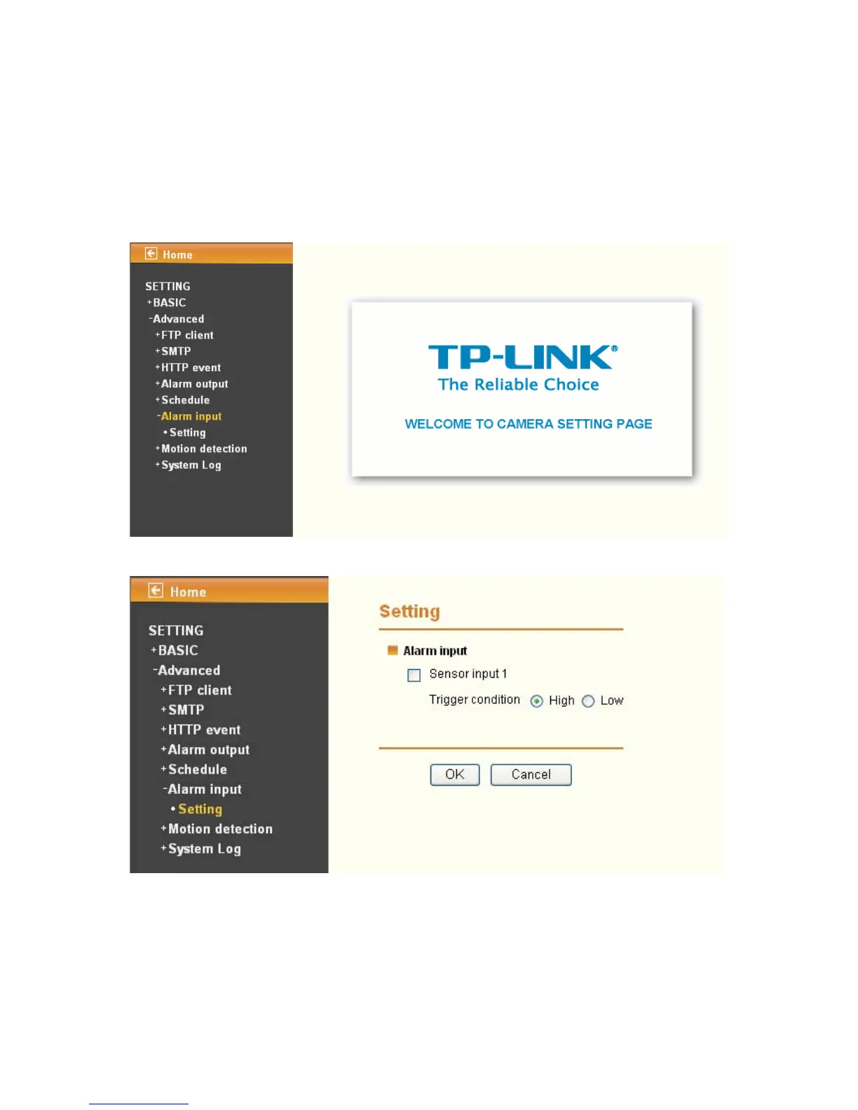 When you click Alarm Input on the Advance mode menu, the Alarm input setting menu appears.