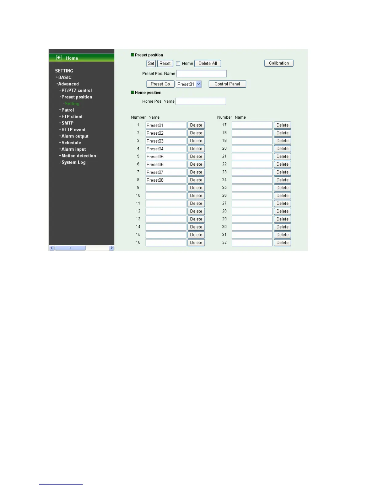 ¾ Delete All: Be careful! When pressing Delete All, all Preset Position information will be deleted.