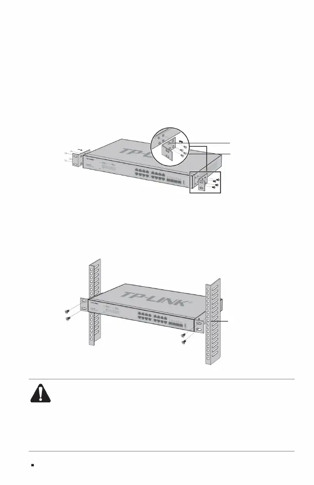 3. Place the switch in an appropriate position in the rack and support it on the bracket; 4. Use screws to fix
