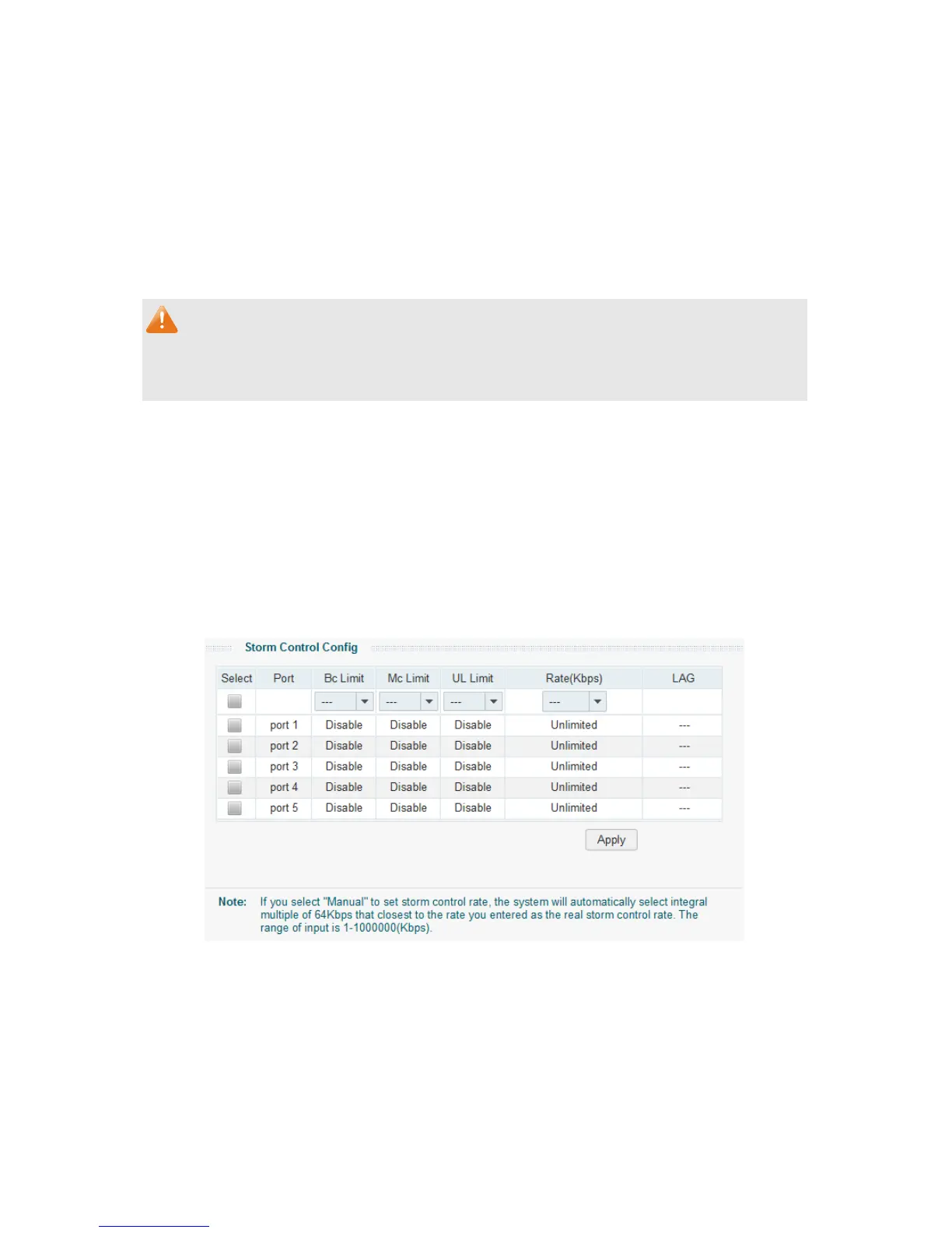 Storm Control function allows the switch to filter broadcast, multicast and UL frame in the