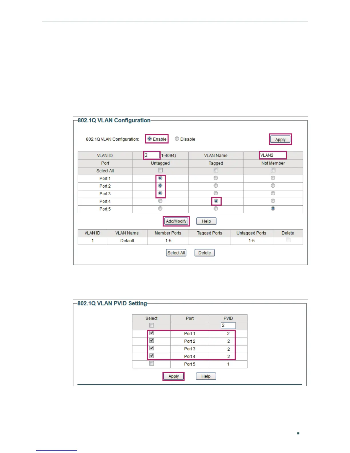 port 2, port 3 and port 4, and specify the PVID as 2 for the ports. Click Apply.