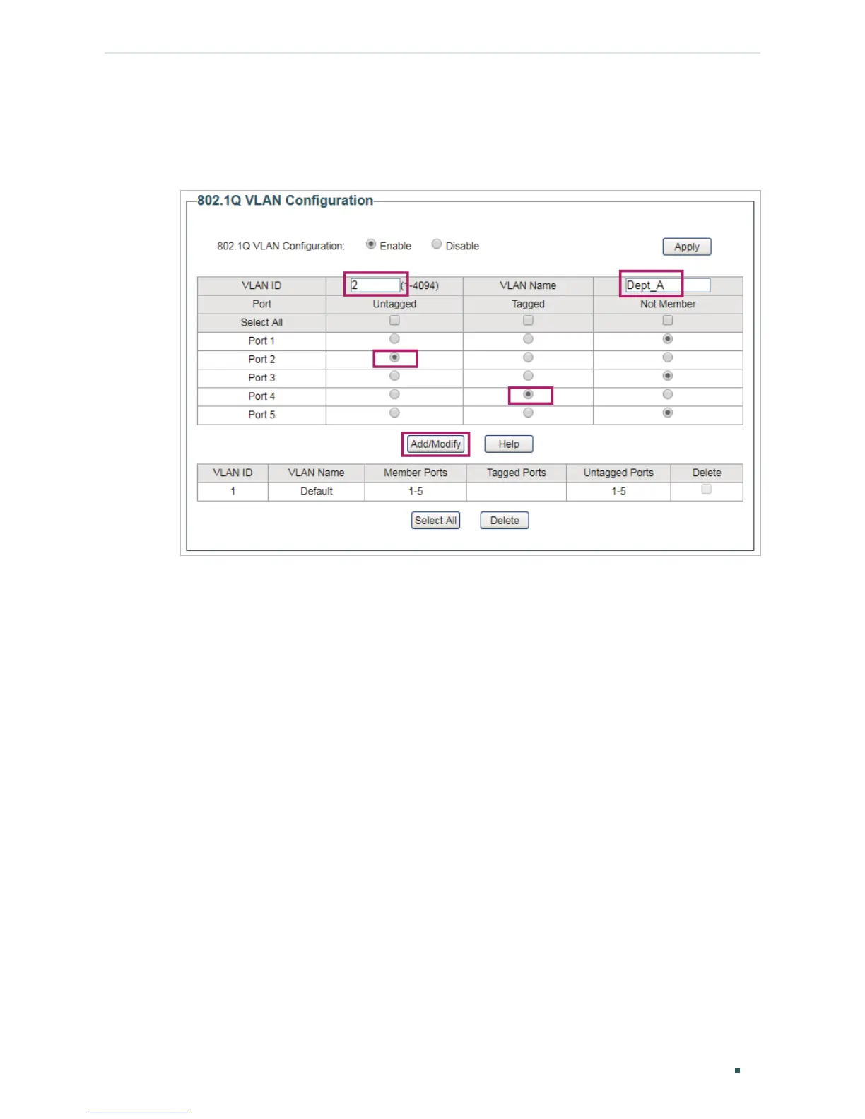 Add port 4 to the VLAN as a tagged port. Click Add/Modify.