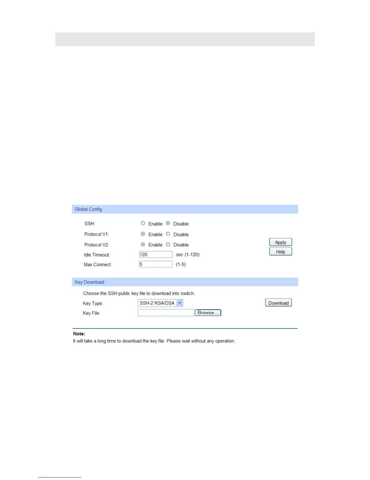 Choose the menu System→Access Security→SSH Config to load the following page.