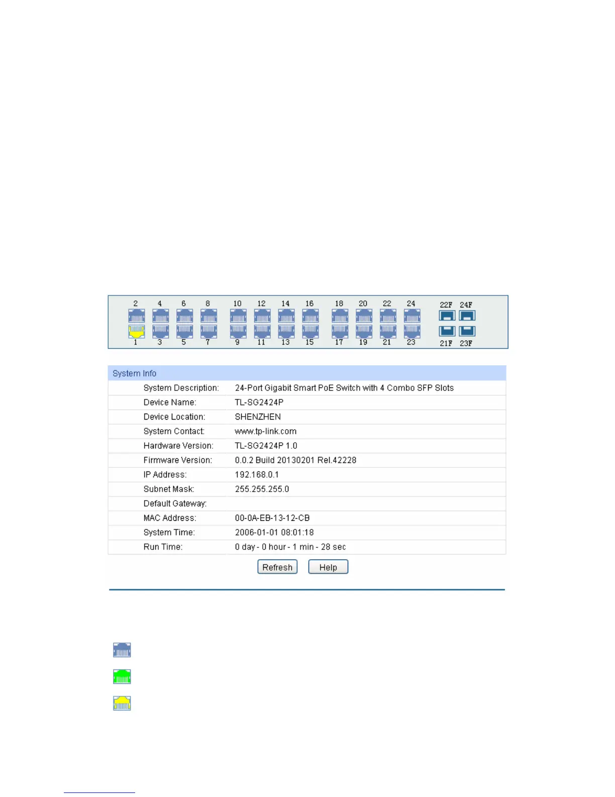 The port status diagram shows the working status of 24 10/100/1000Mbps RJ45 ports and 4 SFP