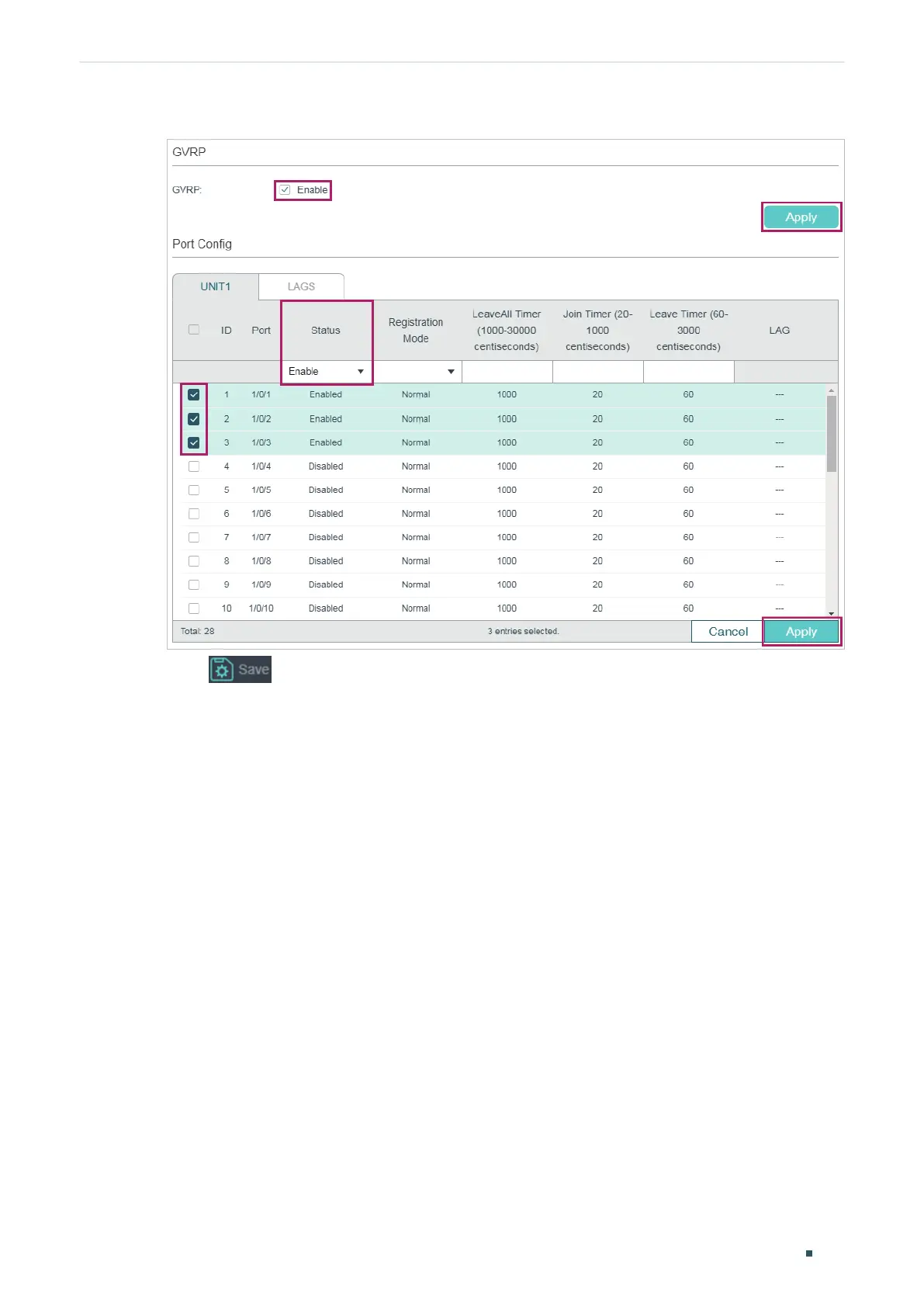 3) Add tagged port 1/0/1 to VLAN 10. Enable GVRP on the port and set the registration