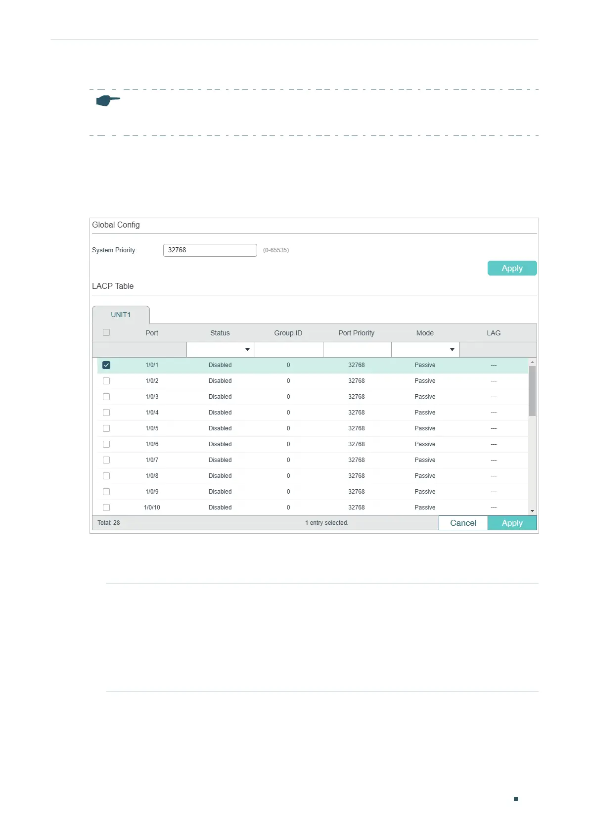 2) Select member ports for the LAG and configure the related parameters. Click Apply.