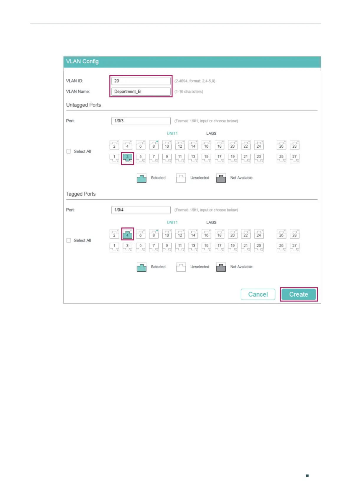 Figure 3-3 Creating VLAN 20 for Department B