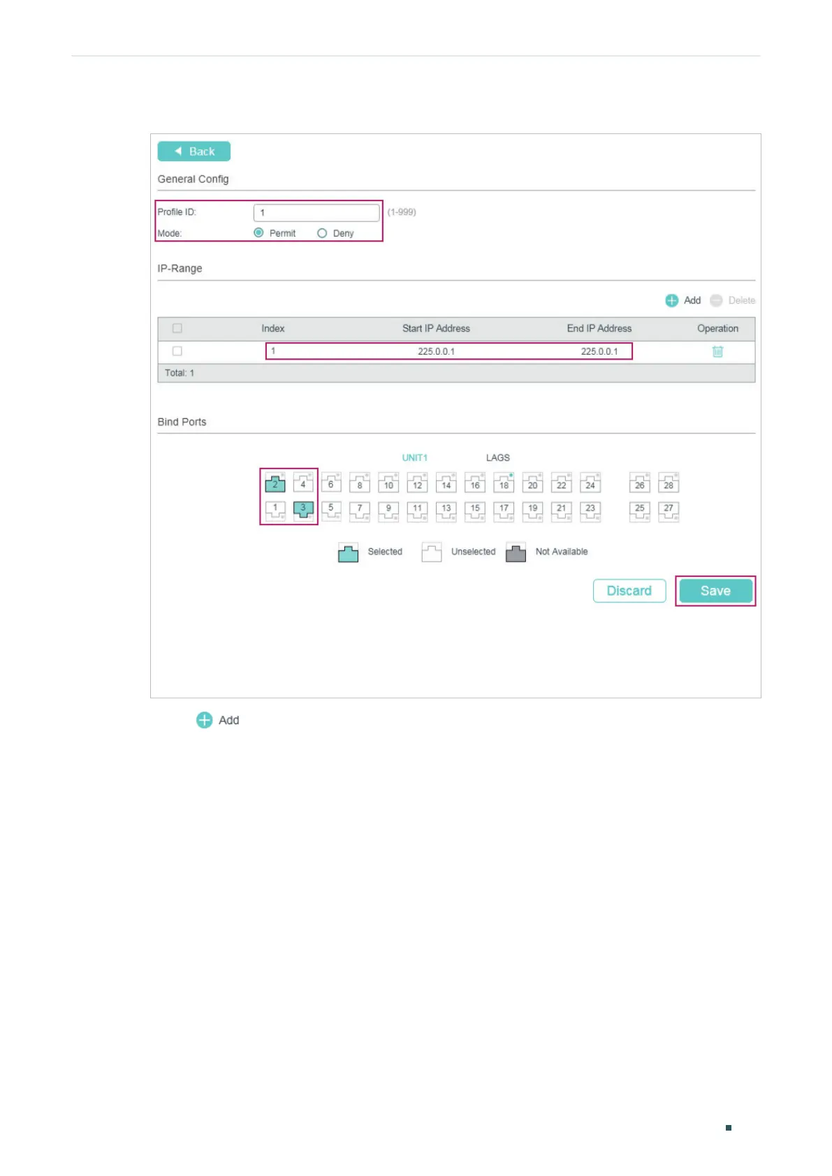 Deny, bind the profile to port 1/0/1, and specify the filtering multicast IP address as