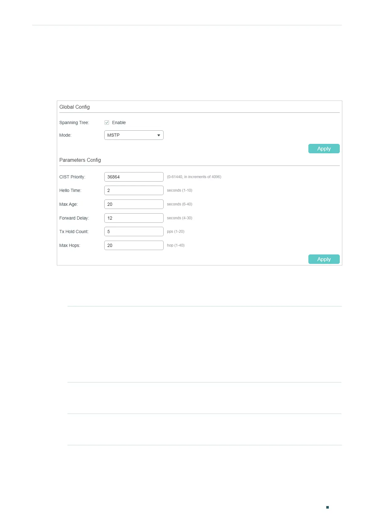 1) In the Parameters Config section, Configure the global parameters of MSTP and click