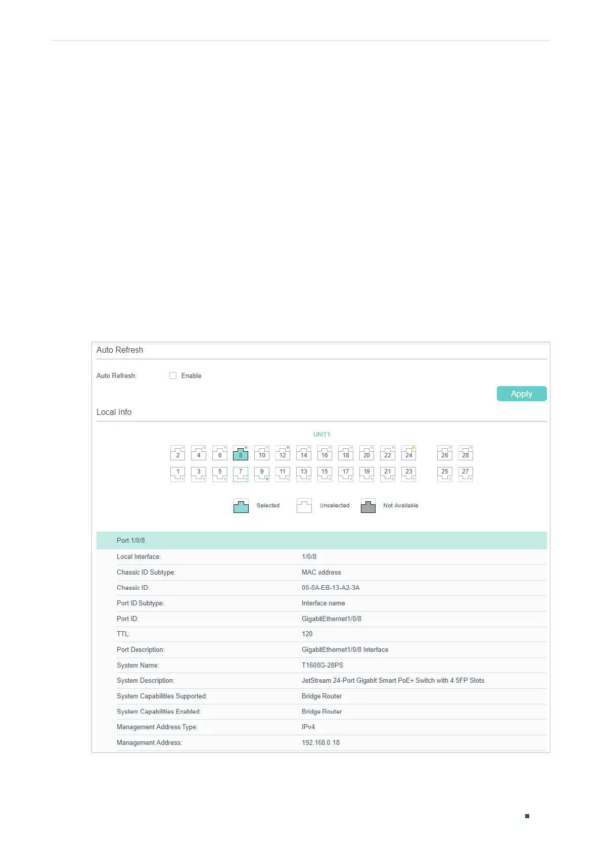 This chapter introduces how to view the LLDP settings on the local device.
