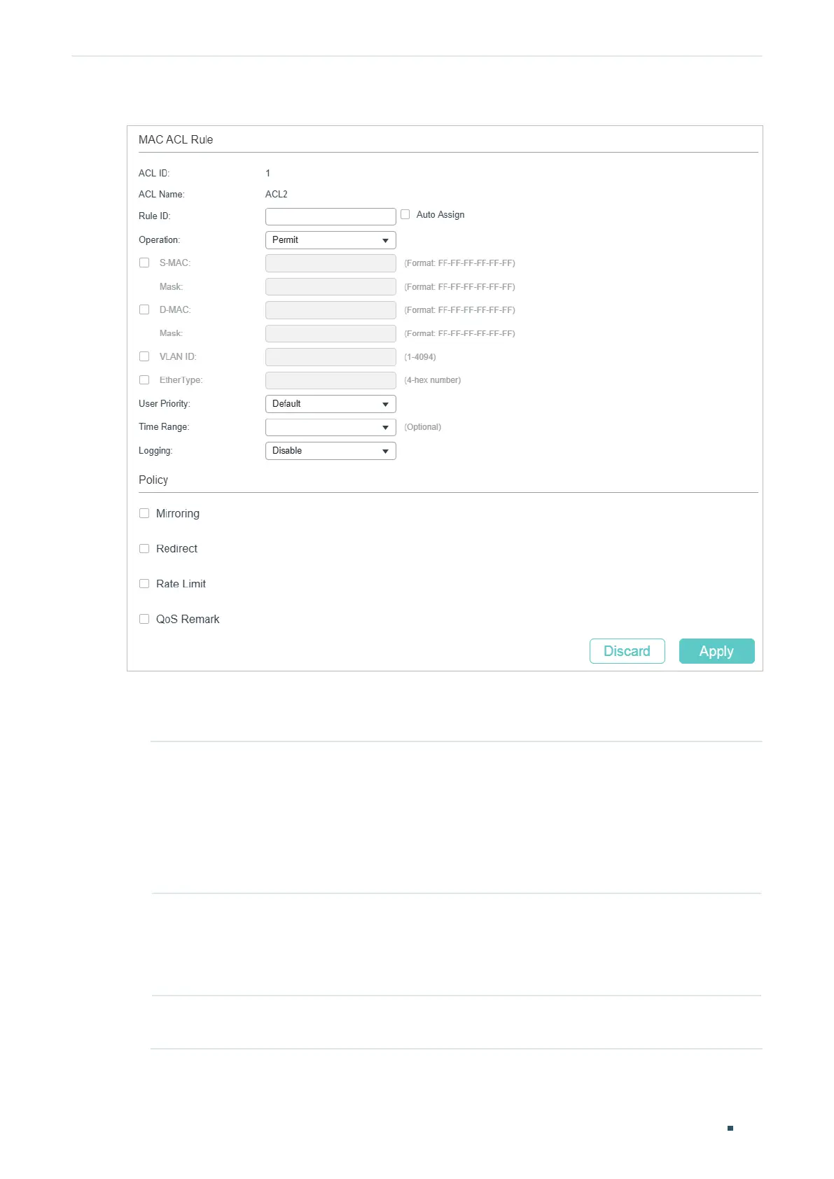 S-MAC/Mask Enter the source MAC address with a mask. A value of 1 in the mask indicates