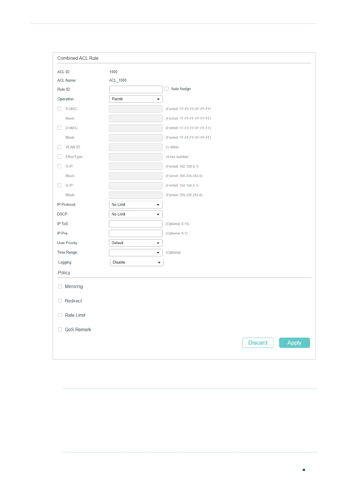 1) In the Combined ACL Rule section, configure the following parameters: