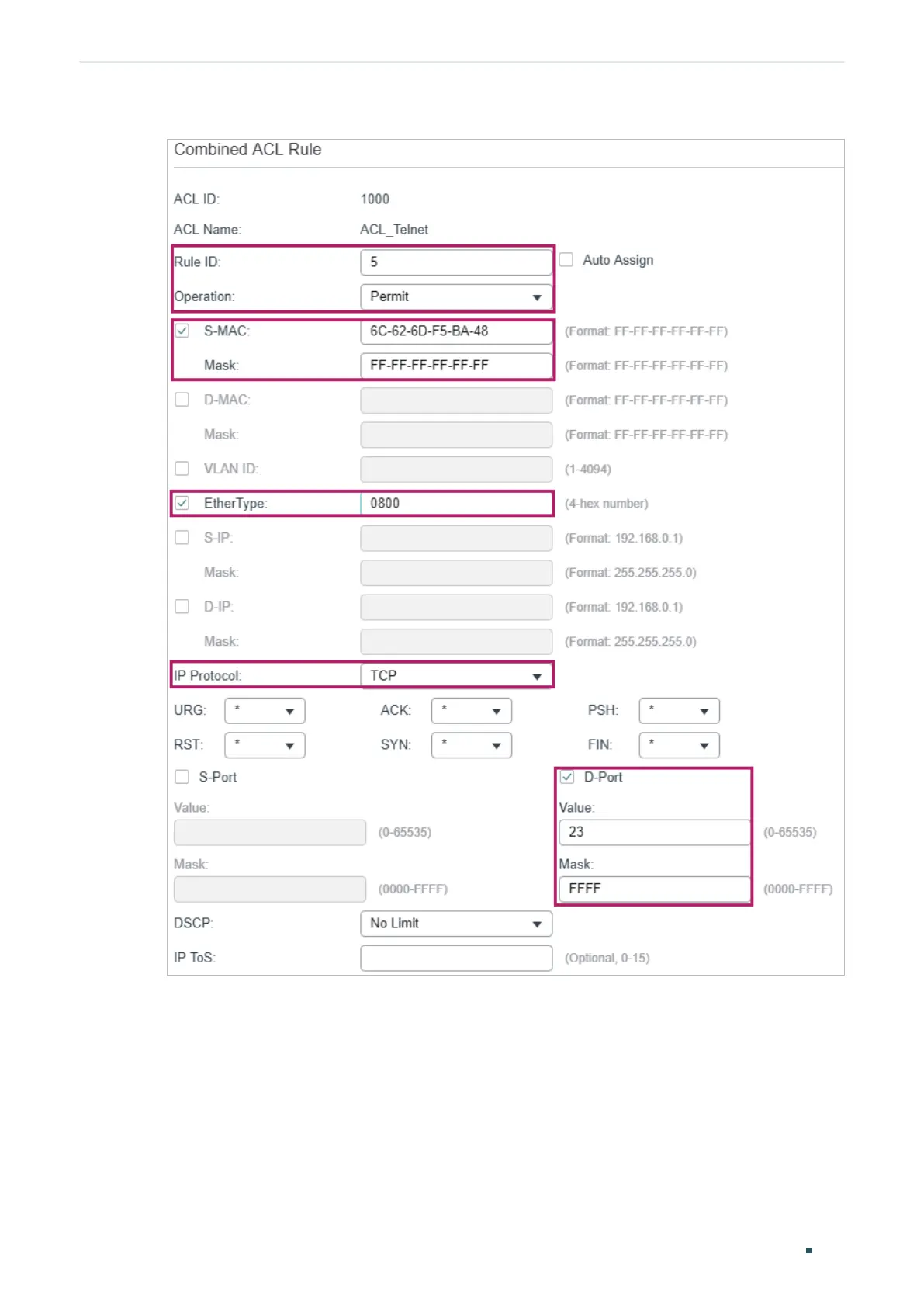 6C-62-6D-F5-BA-48, and destination port TCP 23 (Telnet service port).