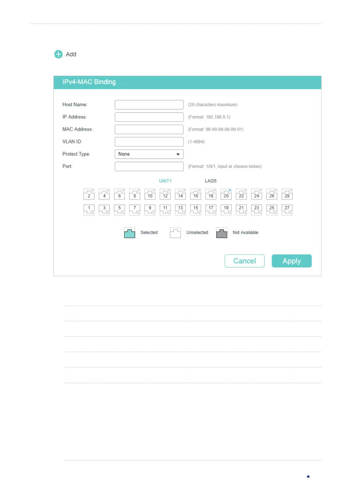 Choose the menu SECURITY > IPv4 IMPB > IP-MAC Binding > Manual Binding and click