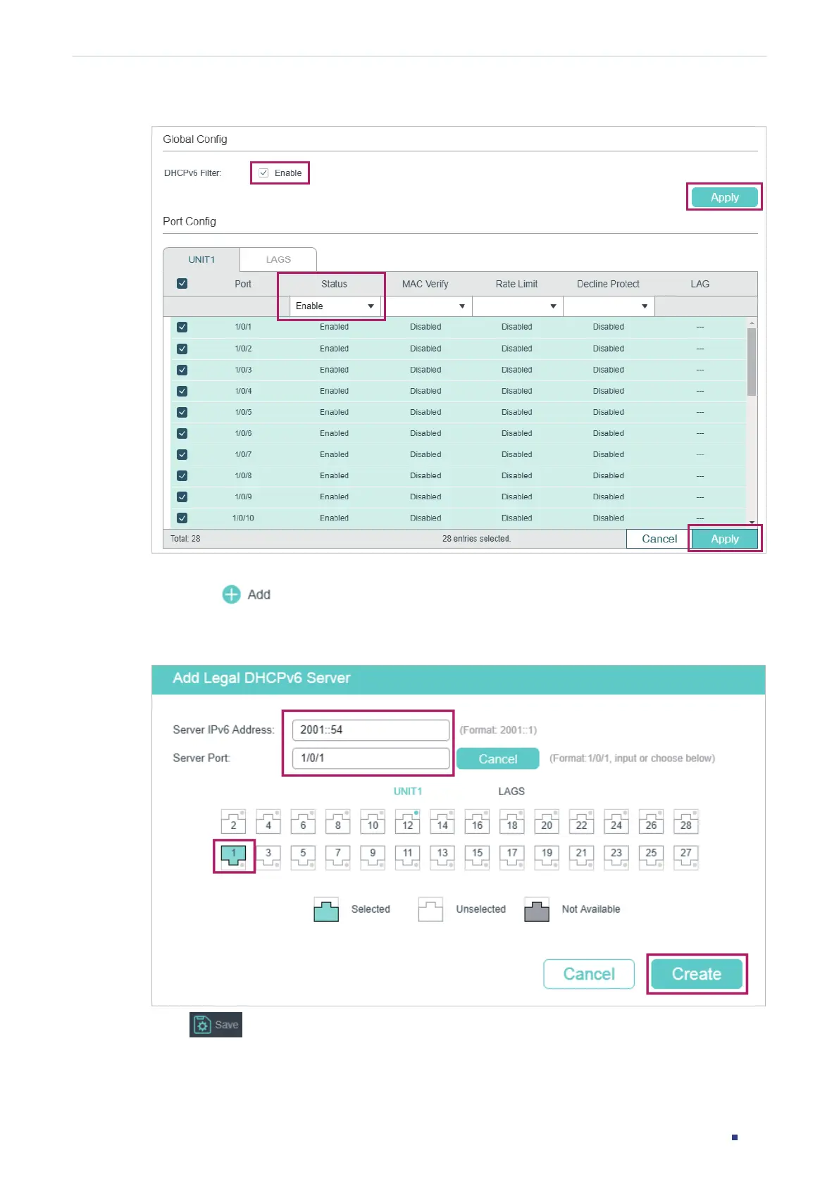 2) Choose the menu SECURITY > DHCP Filter > DHCPv6 Filter > Legal DHCPv6 Servers