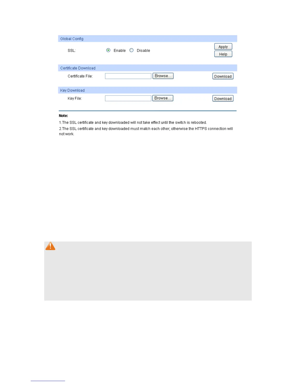 2. The SSL certificate and key downloaded will not take effect until the switch is rebooted.