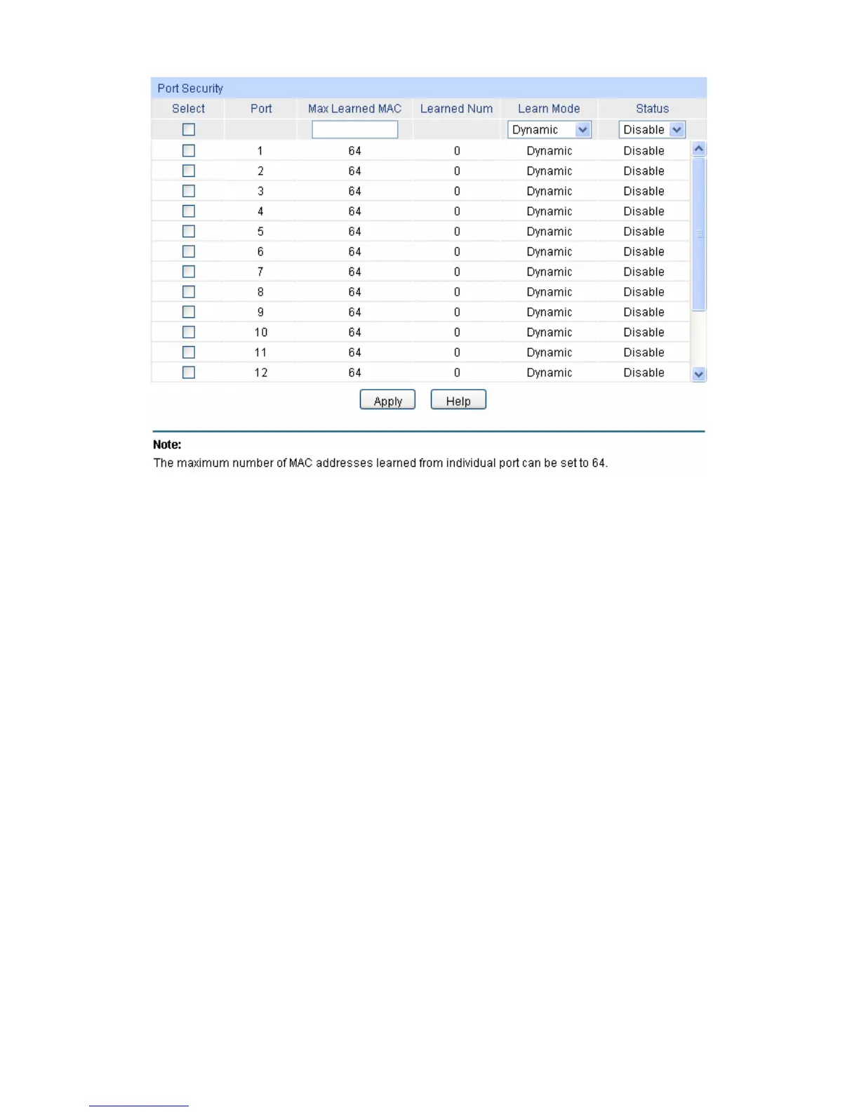 Status: Select Enable/Disable the Port Security feature for the port.