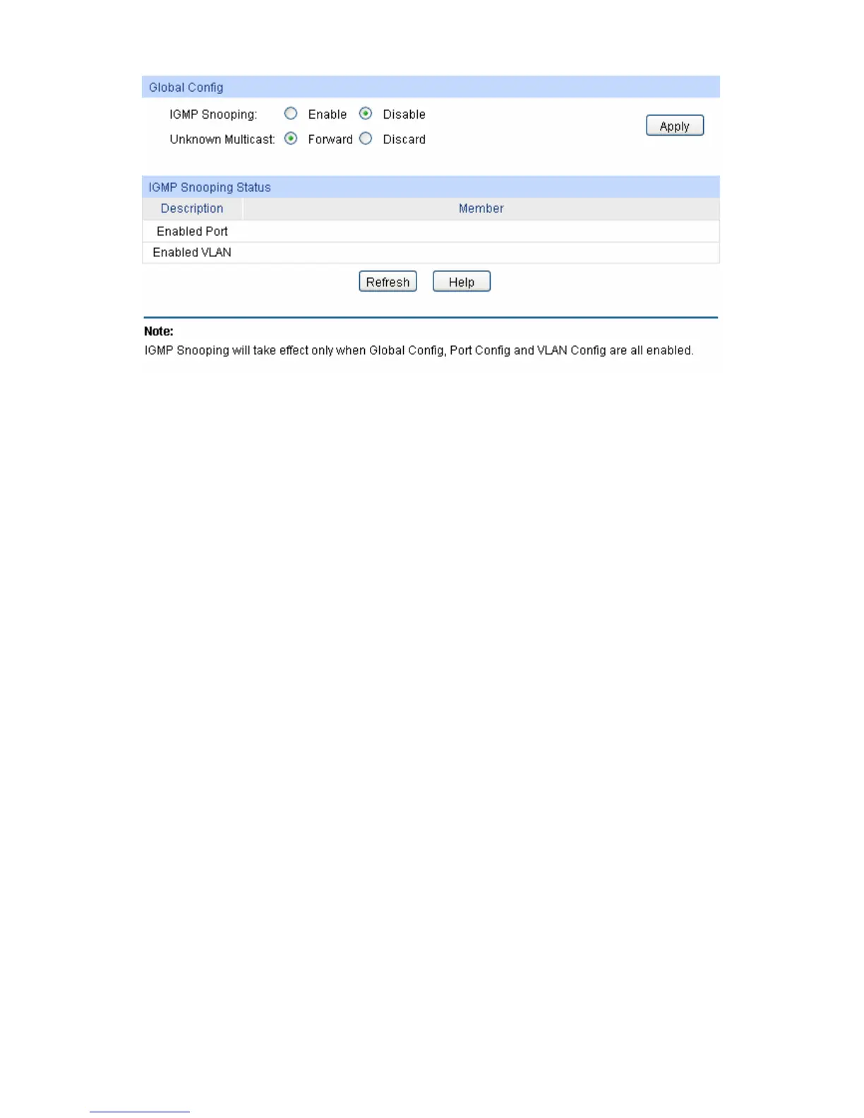 IGMP Snooping: Select Enable/Disable IGMP Snooping function globally on the
