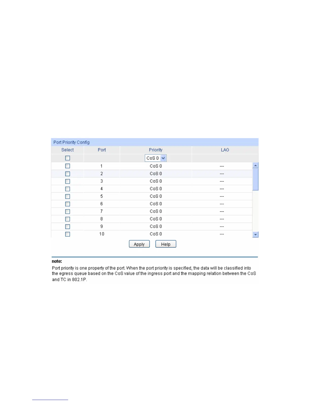 Select: Select the desired port to configure its priority. It is multi-optional.
