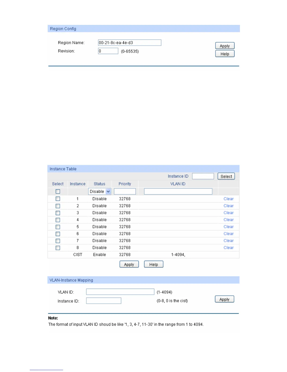 Choose the menu Spanning Tree→MSTP Instance→Instance Config to load the following page.