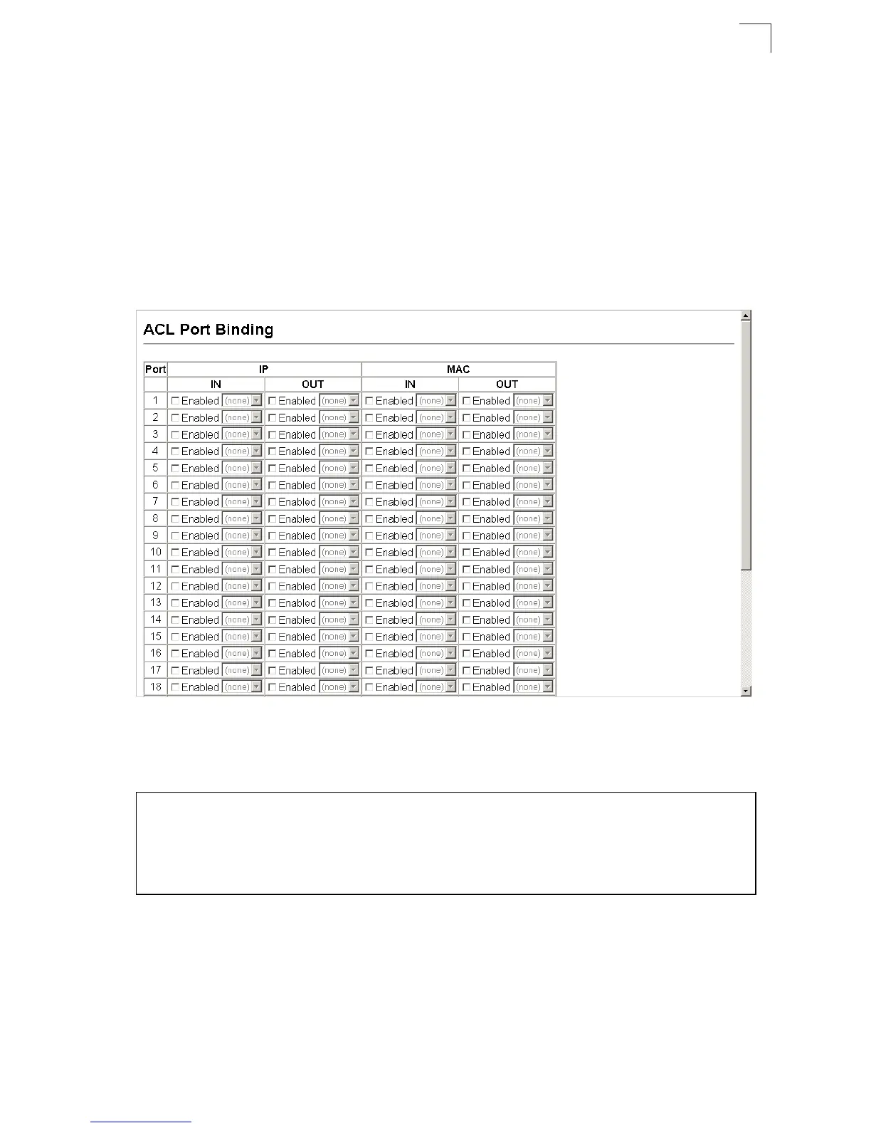 for the ACL type. Mark the Enable field for the port you want to bind to an ACL for