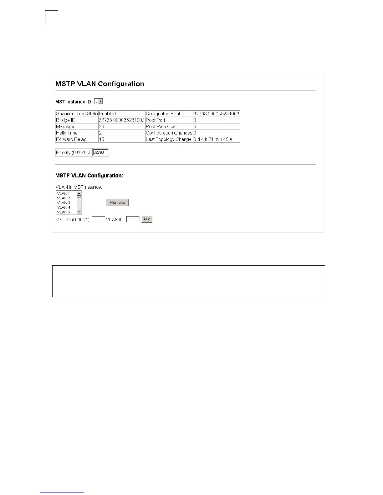 CLI – This example sets the priority for MSTI 1, and adds VLANs 1-5 to this MSTI.