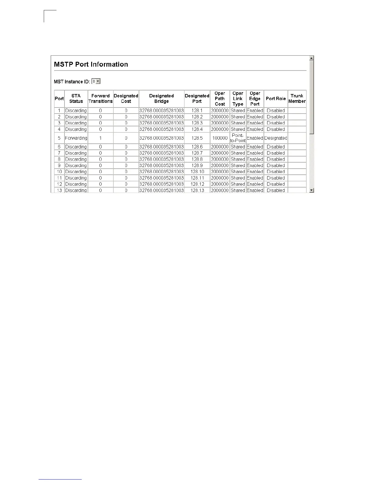 Web – Click Spanning Tree, MSTP, Port or Trunk Information. Select the required