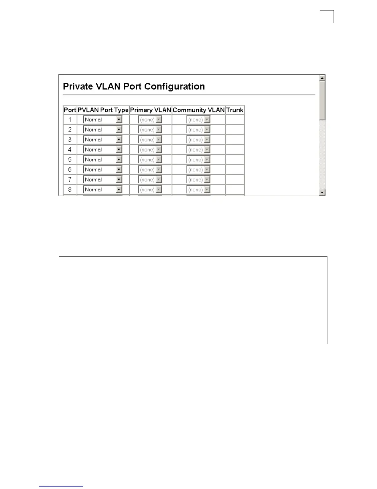Web – Click VLAN, Private VLAN, Port Configuration or Trunk Configuration. Set the