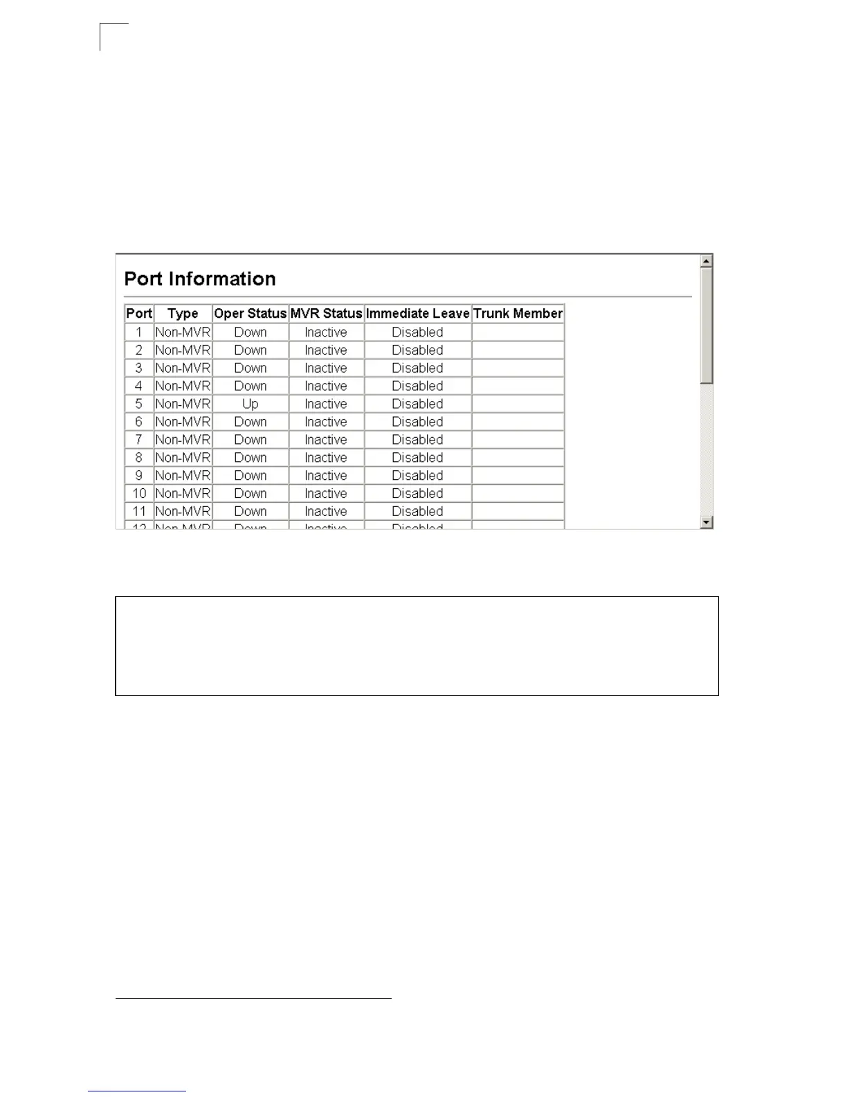 • MVR Status – Shows the MVR status. MVR status for source ports is “ACTIVE” if
