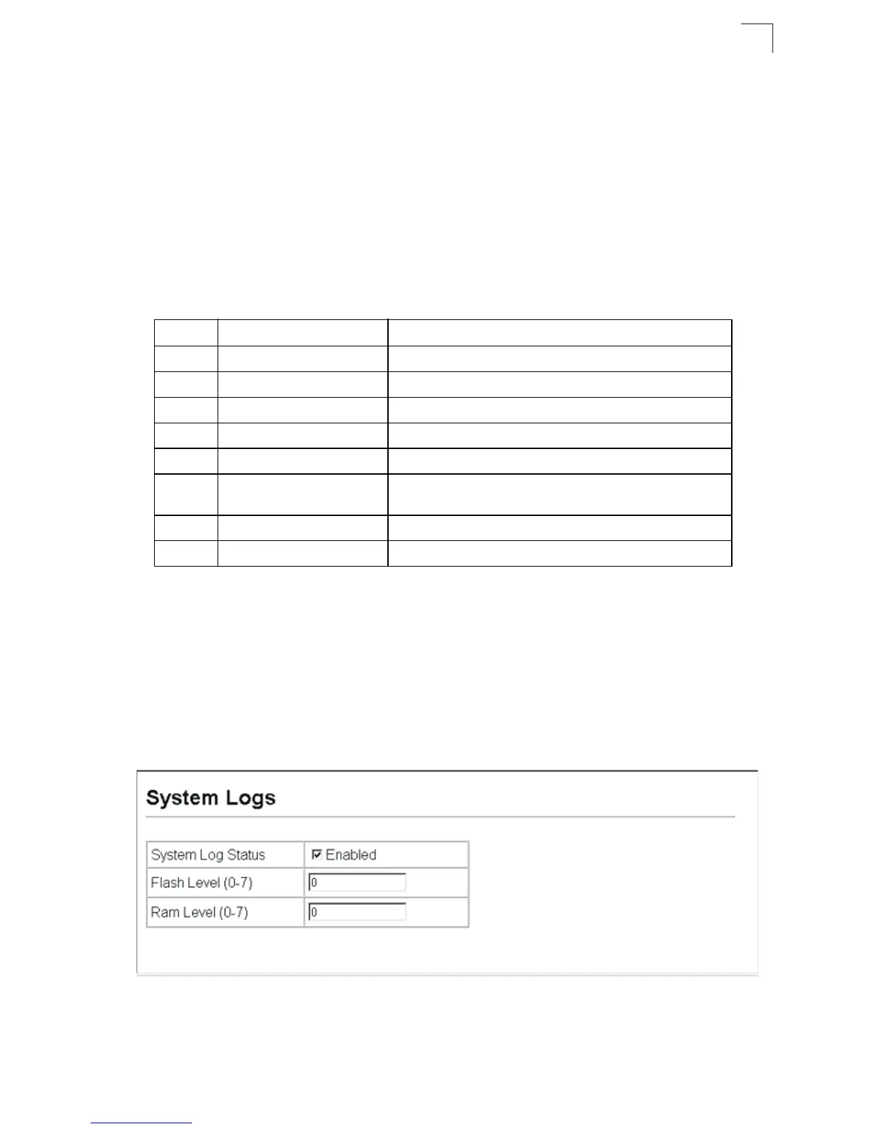 • Flash Level – Limits log messages saved to the switch’s permanent flash memory