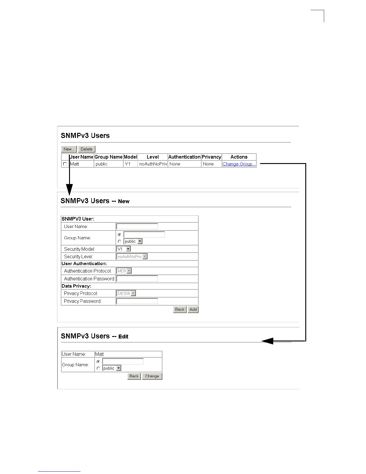• Actions – Enables the user to be assigned to another SNMPv3 group.