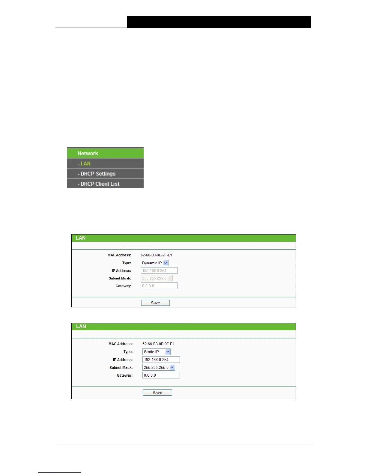 Selecting Network > LAN will enable you to configure the IP parameters of Network on this page.