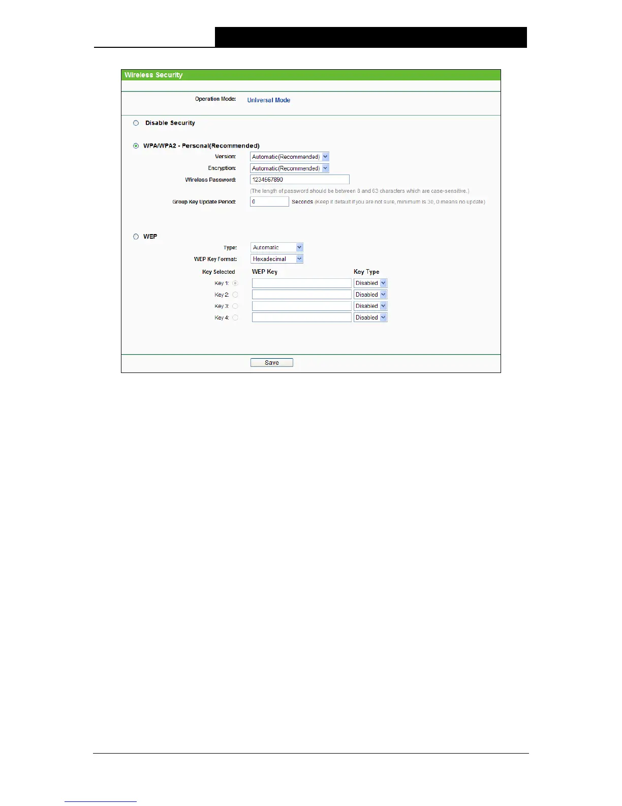 Disable Security - Check this box radio button to disable wireless security. If disabled, the