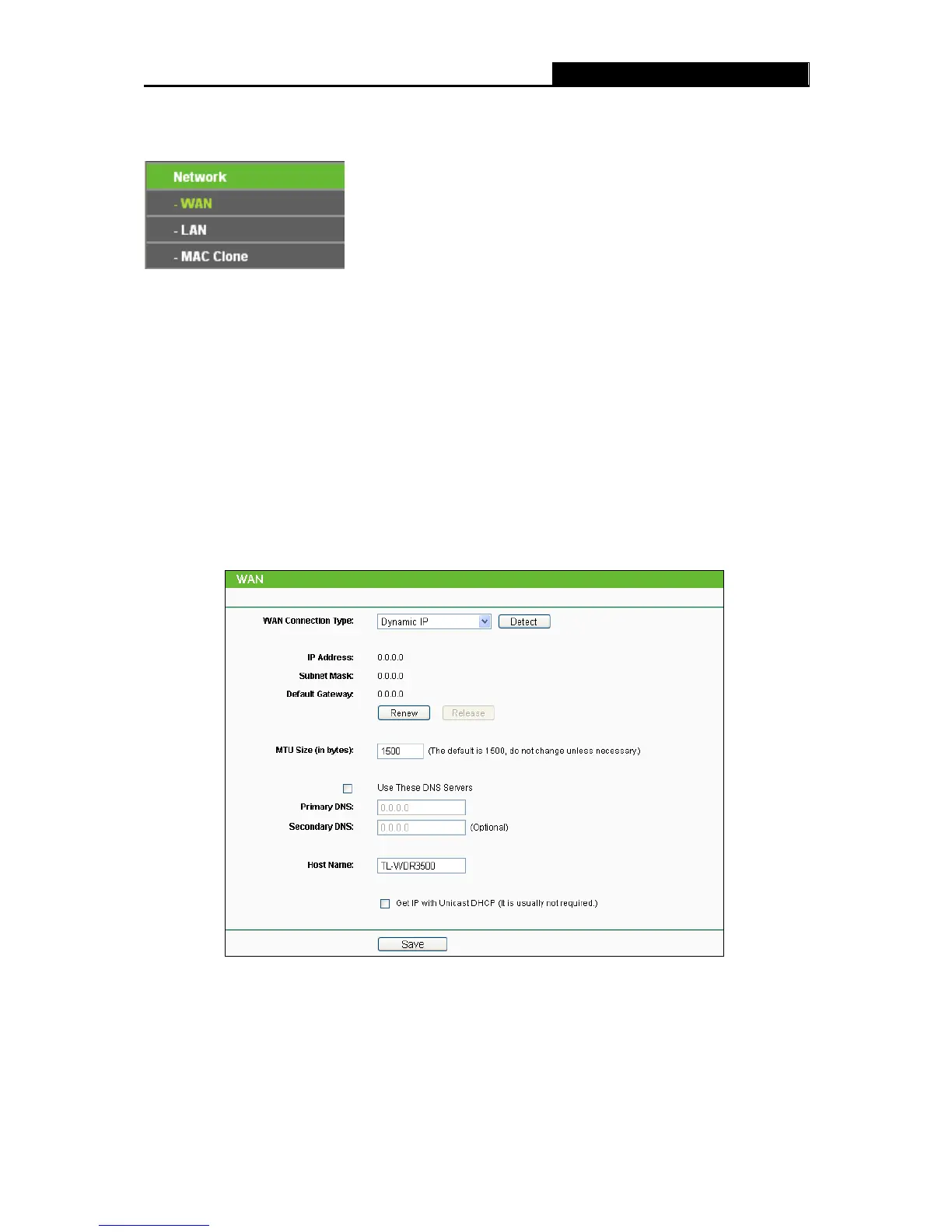 There are three submenus under the Network menu (shown in Figure 4-2): WAN, LAN and MAC