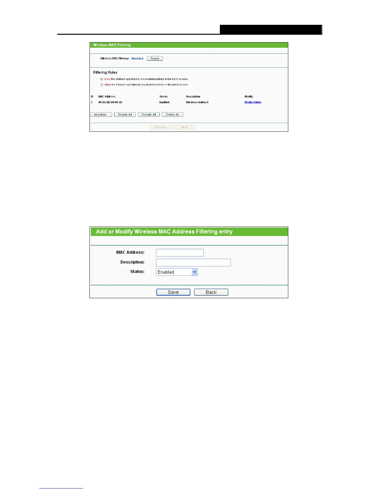 To add or modify a MAC Address Filtering entry, follow these instructions: