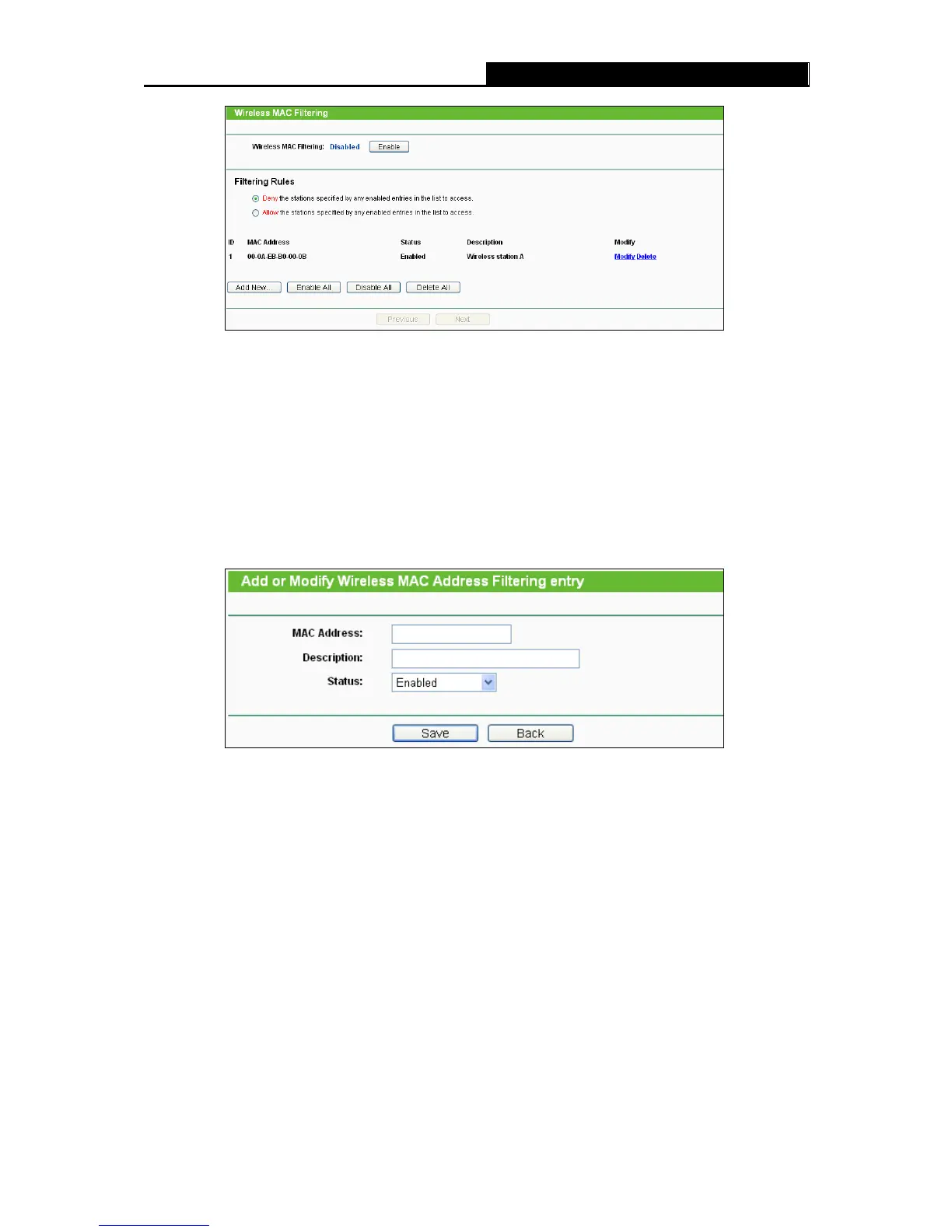 Wireless MAC Address Filtering entry" page will appear, shown in Figure 4-25: