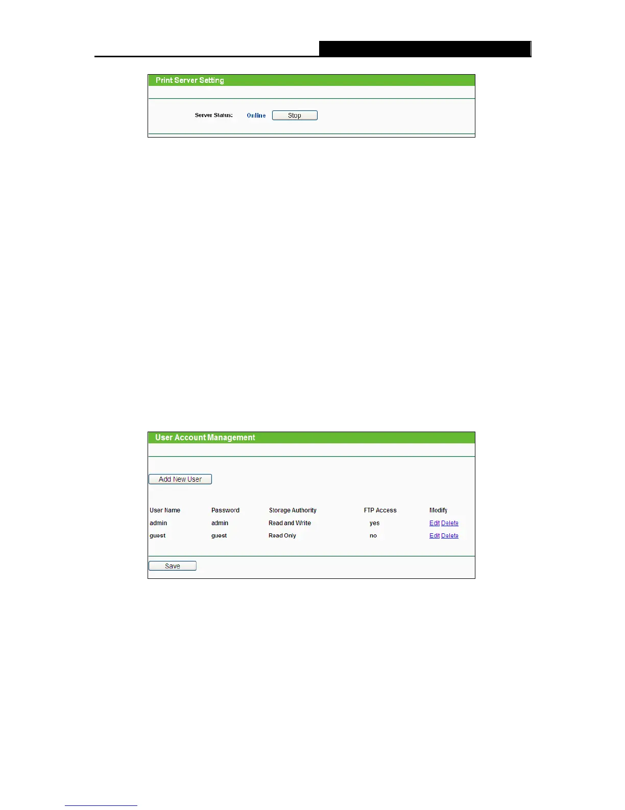 There are two default user accounts that can access the Storage Sharing and FTP Server. They