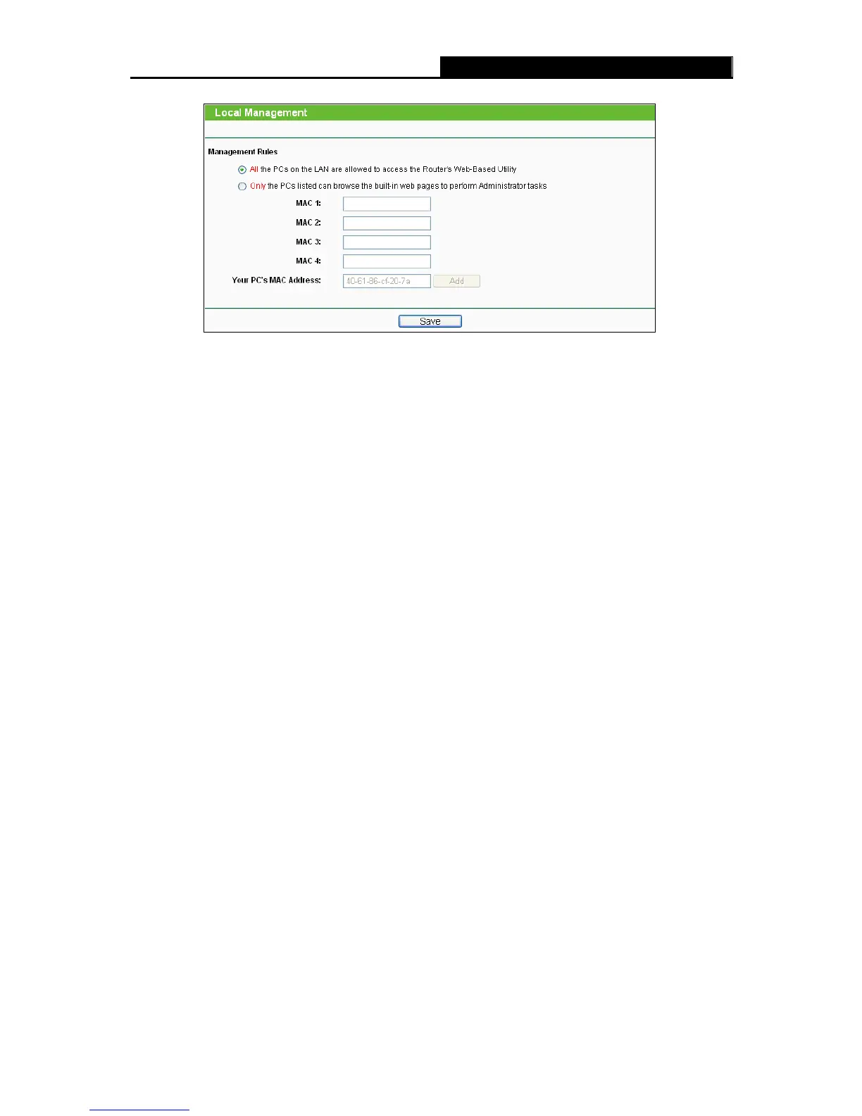 After click the Add button, your PC's MAC Address will be placed in the list above.