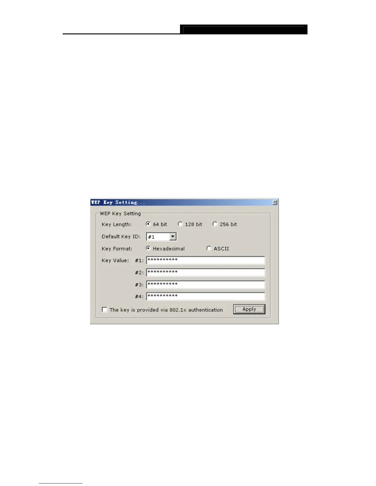 ¾ Key Value #1 - #4: You may enter up to 4 different WEP keys. The WEP key selected