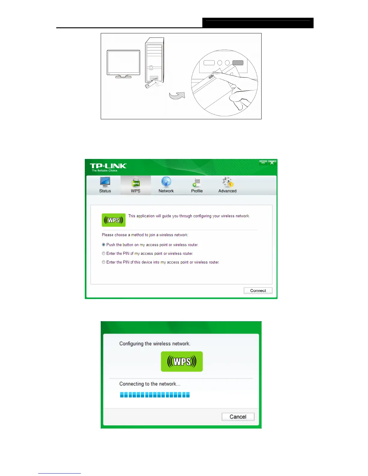 Open TWCU and click WPS tab. Select Push the button on my access point or wireless