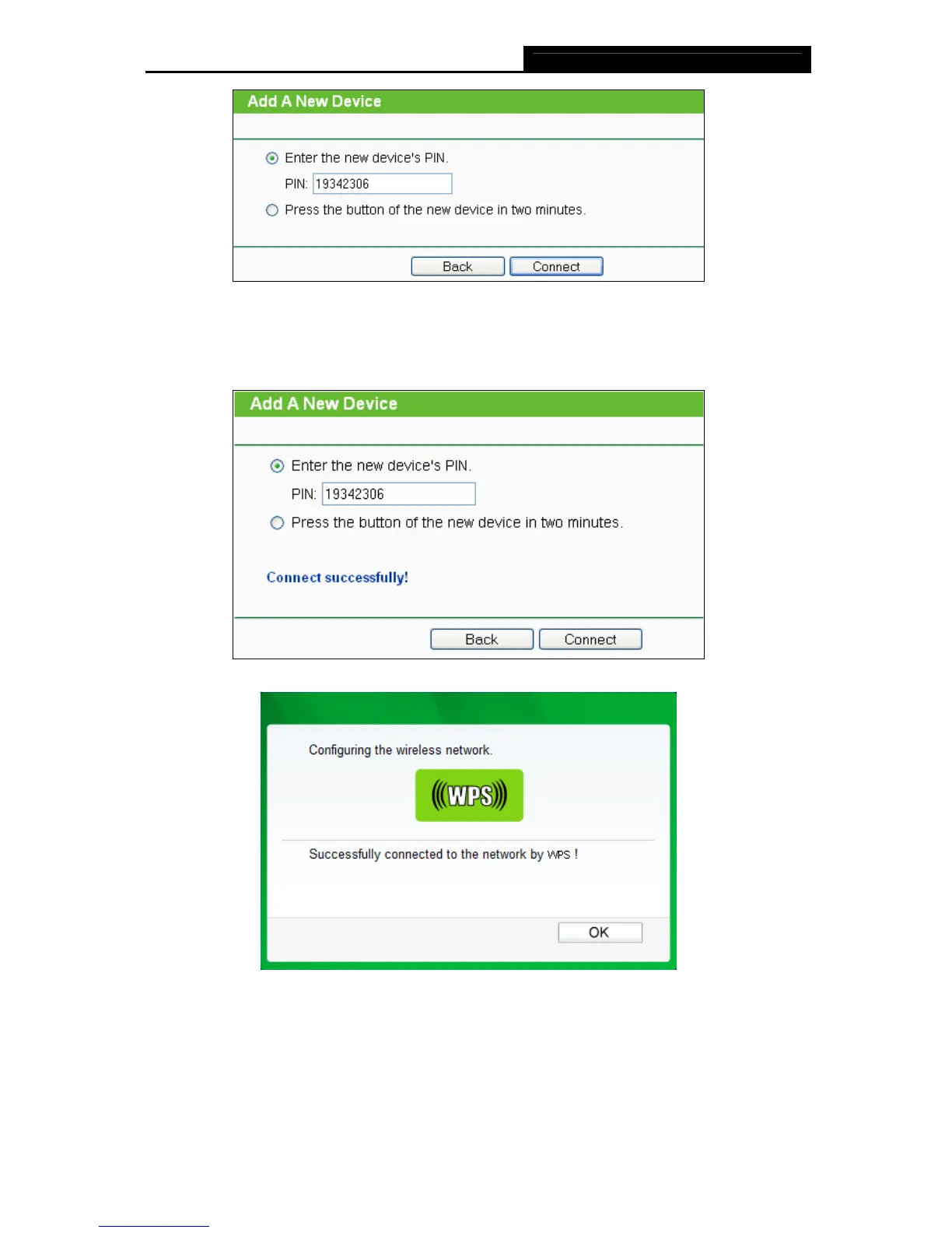 3. When Connect successfully appears on the screen, the WPS configuration is complete.