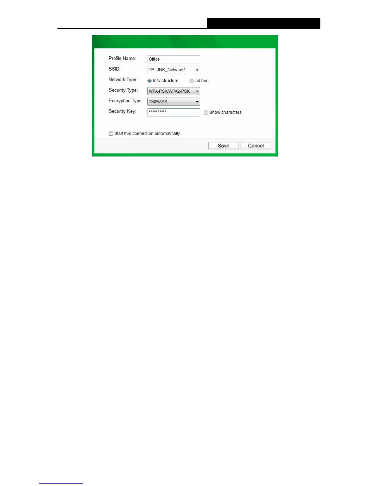 ¾ Security Key: Enter the passphrase exactly as it is on your wireless router or access point.