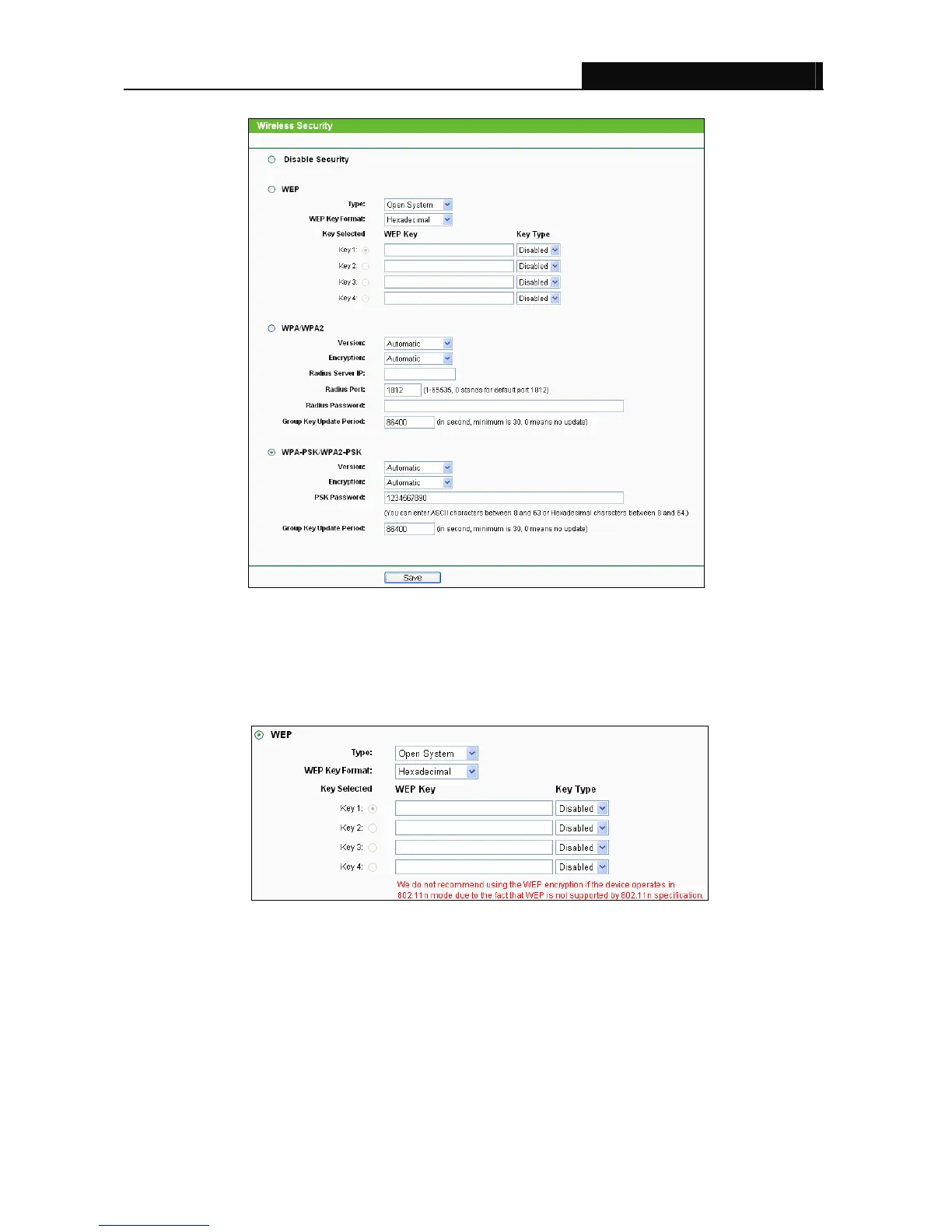 ¾ Disable Security - Check this radio button to disable wireless security. If disabled, the wireless