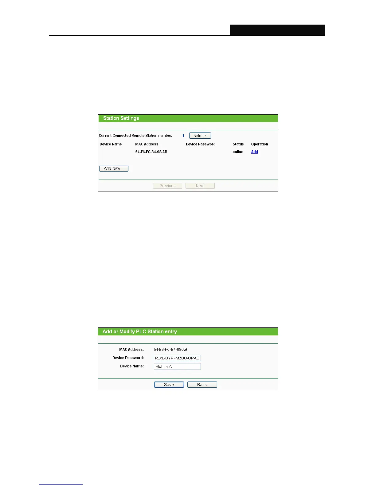 To add or modify a station entry, click the Add or Modify button in operation column and following these
