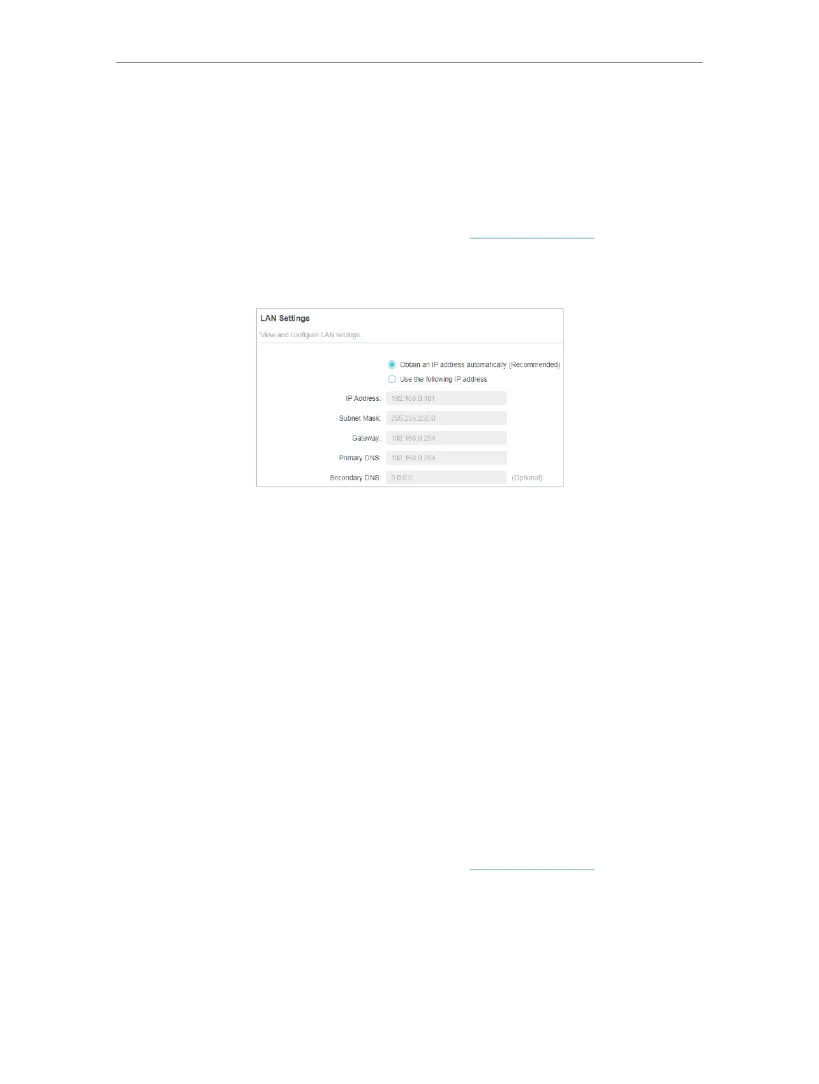 obtain IP Address from the main router. Select Use the following IP address to manually